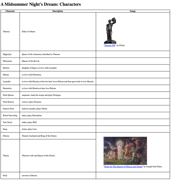First take the text from characters.txt and build an HTML page. Build an HTML table containing the characters, with columns for name, description, and an image. Images are provided for Theseus and Oberon/Titania. You should try and find other images for the other characters.